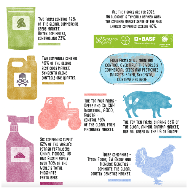 In the production phase, farmers in both developed and developing countries suffer. Farmers in developed countries need to purchase only from IP-protected companies. Developing countries, most of which are members of the World Trade Organization needs to comply with the Trade-Related Intellectual Property Rights or TRIPS agreement, which require them to use genetically modified seeds. Farmers have a limited target market and higher product prices (due to seed, fertilizer, and machinery), giving corporations most power. This cost does not rest to farmers but transfer to buyers. Grocery prices are high with limited alternatives, and supply chains are fragile. Post-production involves food processing, packaging, and distribution, where oligopolies are even more pronounced. Nestlé (Switzerland), a behemoth in this space, is joined by PepsiCo (U.S.), Coca-Cola (U.S.), Unilever (Netherlands/U.K.), and Mars (U.S.) to dominate global food and beverage production. These five companies control a substantial portion of processed foods, with Nestlé alone reporting CHF 4.8 billion in health science sales in the first nine months of 2025. The global food processing market is highly concentrated, with these firms leveraging economies of scale to outcompete smaller players. In ultra-processed food, oligopolistic structures enable market power through branding and distribution networks, often prioritizing profits over nutritional value.