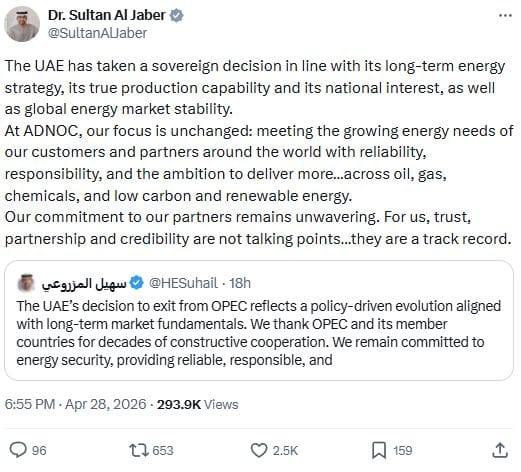 UAE leaving OPEC is not just an energy story. It is a geopolitical rupture. The UAE has chosen sovereign production policy over cartel solidarity. It has prioritized investor commitments, national capacity targets, and strategic autonomy over collective discipline.